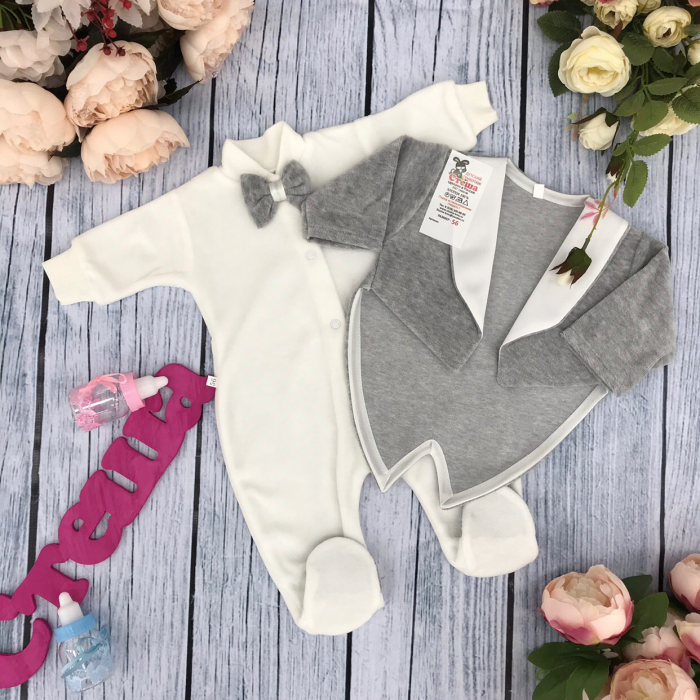 Комплект из 2-ух изделий. Комбинезон из интерлока-пенье, фрак из велюра ,украшен воротником из атласа.