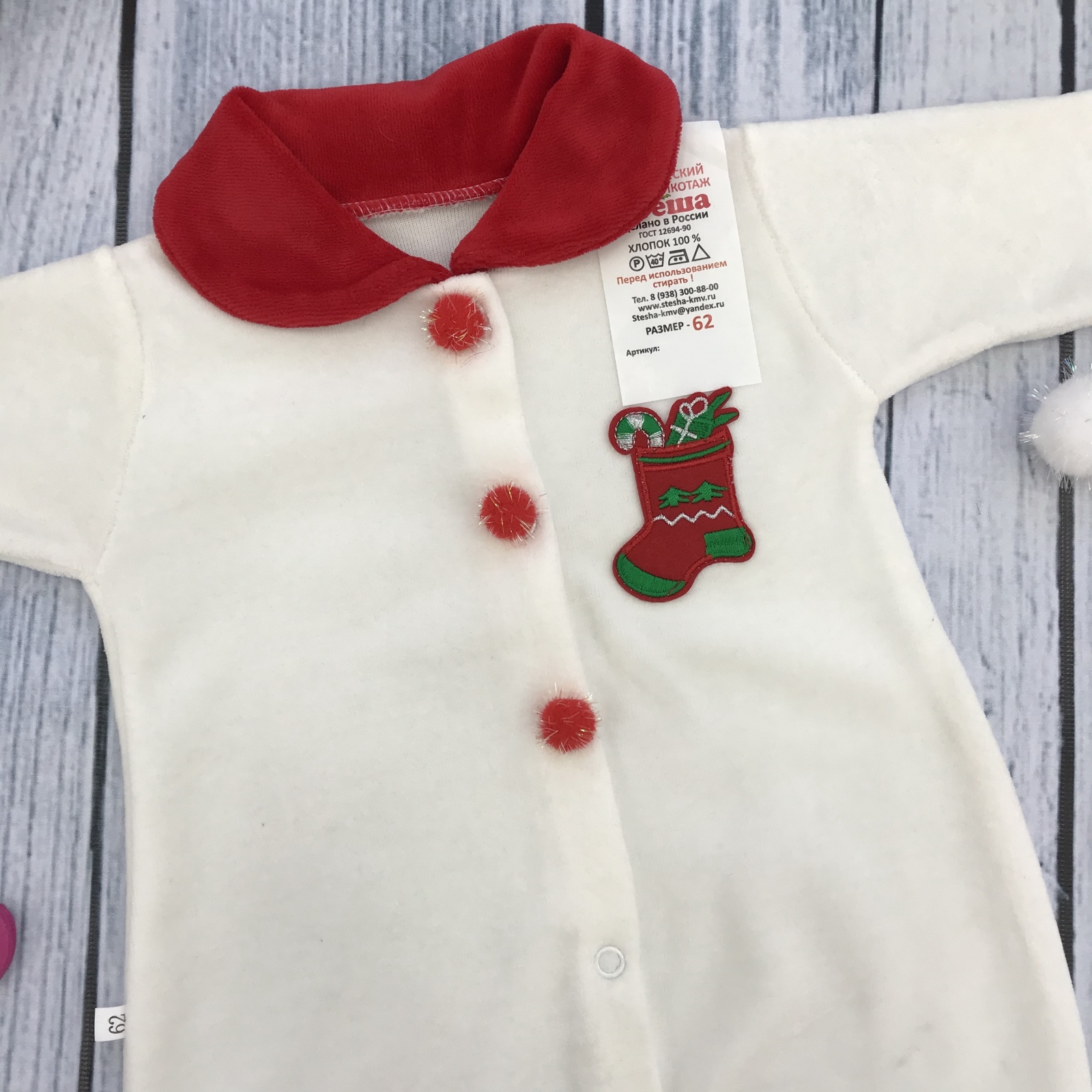 Теги: Купить оптом новогодний комбинезон от производителя. 244. Комбинезон Санта, хлопок 80% велюр 20% ПЭ, молочный 56,62,68 цена,отзывы официальный сайт "Стеша Киров"