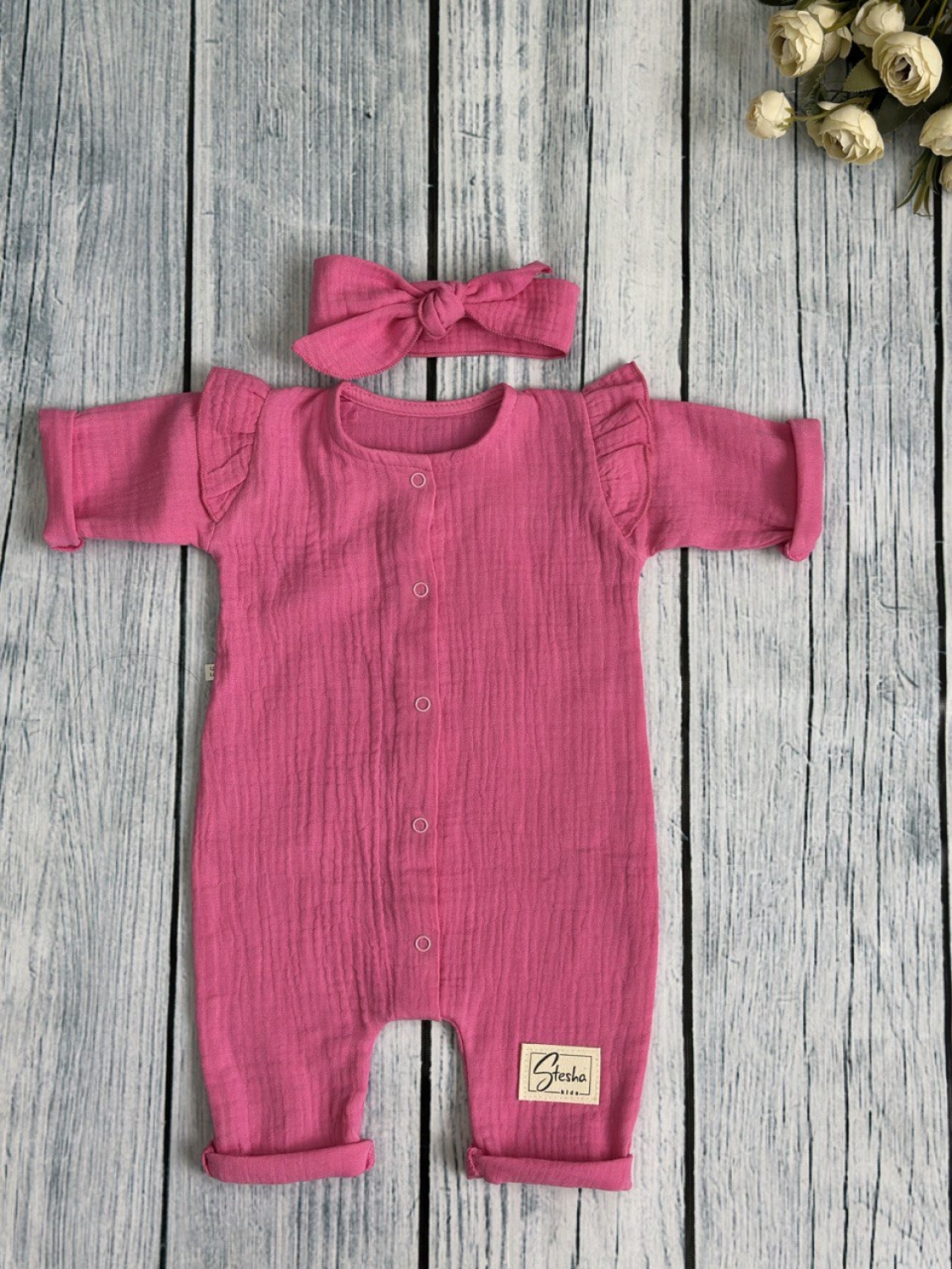 Теги: Купить оптом детский комбинезон . 336-Ф. Комбинезон с повязкой для девочки из муслина, хлопок 100%, размеры 56,62,68, фуксия цена,отзывы официальный сайт "Стеша Киров"