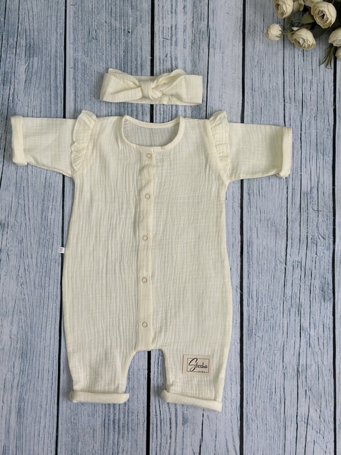 336-СЛ. Комбинезон с повязкой для девочки из муслина, хлопок 100%, размеры 56,62,68, сливочный